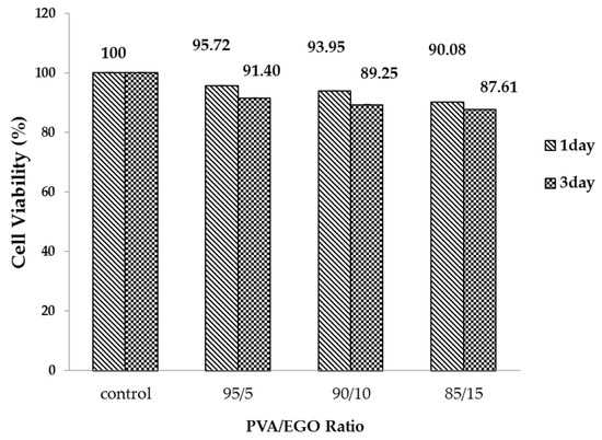 Figure 6 shows that regardless of whether the PVA/EGO ratio is 95/5, 90/10, and 85/15, the cell viability of fibroblasts reaches the standard. For the one-day-culture group, more EGO has a negative influence on the cell viability of fibroblasts. The cell viability is 95%, 93%, and 90% when the PVA/EGO ratio is 95/5, 90/10, and 85/15, suggesting that all of the PVA/EGO nanofibrous membranes have good cell viability. For the three-day-culture group, the cell viability is 91%, 89%, and 87% when the PVA/EGO ratio is 95/5, 90/10, and 85/15. It is clear that cell viability decreases by 3%–4% when the culture time is expanded to three days. This result is due to the fact that the cells have grown and occupied all the space in the culture well in one day. When the culture is expanded to 72 h, there is no space for the newly grown cells, which leads to comparatively lower cell viability.