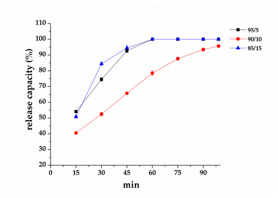 The release capacity (%) of nanofibrous membranes as related to the PVA/EGO ratio.