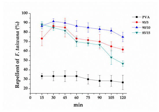 In Figure 7, the infrared moisture determination balance test is conducted in order to verify that essential oil is released and whether it shows the repellent effect against F. taiwana. With a PAV/EGO ratio of 95/5 and 85/15, the resulting nanofibrous membranes release the whole essential oil in 90 min. By contrast, the essential oil is not completely released in 99 min from the nanofibrous membranes made with a 90/10 ratio. Because of the absence of valid repellent efficacy against F. taiwana, Y-tube olfactometer is, thus, conducted to make up for it. Figure 8 compares the repellent effectiveness of PVA/EGO nanofibrous membranes in terms of the PVA/EGO ratio and evaporation time. Compared to the repellency of the 95/5, 90/10, and 85/15 groups in the first 15 min, the 95/5 nanofibrous membranes have lower effectiveness of 73%. Compared to the other two groups, the group made with a PVA/EGO ratio of 95/5 yields the finest diameter of 349 nm, as shown in Figure 5. The evaporation of essential oil is more efficient when the fiber diameter is large. Therefore, as for the 95/5 group, the evaporation of essential oil does not generate a saturated gas concentration in the first 15 min, which, in turn, renders this specified group with a lower repellent efficacy. The repellent efficacy is 86.6% for 30 min and 85% for 45 min because the concentration reaches saturation. When exceeding 60 min, the repellent efficacy is reduced from 73% to 61% as a result of a decrease in the released amount of essential oil. When the PVA/EGO ratio is 90/10, the EGO is well wrapped and the repellent effectiveness has a tendency that first increases and then decreases. The nanofibrous membranes give an 85% repellency for the first 15 min and over 90% repellency for the first 30 min. Afterward, the EGO decreases with evaporation time, and the repellency thus eventually decreases. Moreover, the 90/10 group remains a repellent efficacy of 75% in 120 min. By contrast, the repellent effectiveness of 85/15 nanofibrous membranes has a tendency of decreasing with time, which is ascribed to the poor wrapping of EGO. The EGO evaporates so soon, and the 85/15 nanofibrous membranes are short-lived in effectiveness, and the repellent efficacy is reduced from 88% to 46%. In light of the service life, the 90/10 nanofibrous membranes outperform the other two groups, and are proved to be the most effective EGO-based repellent. The 90/10 group gives a 75% repellency lasting 120 min.