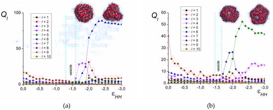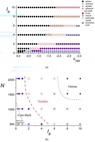 - Glagoleva, A.A.; Vasilevskaya, V.V.; Khokhlov, A.R. Vesicle-Like Globules of Amphiphilic Macromolecules. Macromol. Theory Simul. 2015, 24, 393–398. [Google Scholar] [CrossRef]