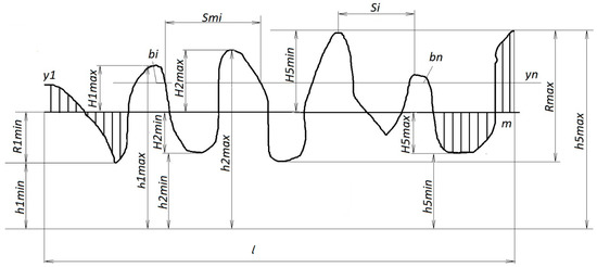 The arithmetic mean deviation Ra of the profile, called the arithmetic mean of the absolute values of the profile deviations within the base length l—Figure 2 [1,24,28], can be calculated from the following equation: