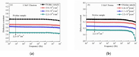 Figure 1e shows the variation in the dielectric constant of PI irradiated with different sources and fluences, the curve of 1 MeV electron uses bottom X-axis, and the curves of other irradiation sources use top X-axis at 100 Hz. The dielectric constant decreases nonlinearly with the increase of irradiation fluences. Figure 1f shows the measurement results with the rate of change of dielectric constant (at 100 Hz). The variation trend of Figure 4f is consistent with that of Figure 1e. These changes in the dielectric constant were calculated by using Equation (1).
