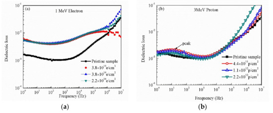 The dielectric loss of pristine and irradiated PI with different sources and fluences is shown in Figure 2 at different frequency and room temperature. From Figure 2a, it can be seen that the dielectric loss of the irradiated PI with 1 MeV electron increases compared with the pristine sample, especially at low frequency, but the dielectric loss increases with the increase in frequency (>104 Hz) and the curves are almost the same after irradiation with different fluences. From Figure 2b,c, the data shows that the dielectric loss decreases a little with the increase in the frequency in the low frequency region, but the dielectric loss increases obviously with the increase of frequency in the high frequency region. It can be seen that the dielectric loss of the irradiated PI with 3 MeV proton shows a movement in the peak compared with the pristine sample at 10 Hz. The peak moves to 100 Hz after the 10 MeV proton. The dielectric loss of irradiated PI increases slightly compared with the pristine PI in the whole frequency. Figure 2d shows the variation of dielectric loss of PI irradiated by 25 MeV carbon ion in different frequency. The dielectric loss of PI irradiated by 25 MeV carbon ion increases with the increase of fluences in low frequency but the curves almost the same in high frequency compared with the pristine sample. The dielectric loss increases with the increase of the frequency for all irradiated and pristine PI samples. The dielectric loss depends on a number of factors, such as orientation polarization and dipole polarization. At low frequency, the dielectric loss is mainly caused by the main chain of the molecule movement polarization relaxation. There is a peak around 100 Hz that may be caused by the space charge polarization relaxation. The strong polarity in the molecular chain can produce unsaturated groups, such as carbonyl group, which have the polarization characteristics of space charge due to the movement ability limited, so the increase in the dielectric loss produces the peak. At high frequency, the dipole polarization relaxation produces the dielectric loss, and the dipole polarization cannot keep up with the change of frequency, thus the dielectric loss increase with the increase of the frequency.