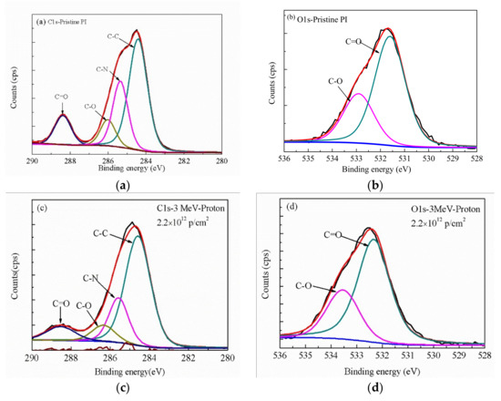 To investigate the chemical bond states and content of PI samples after irradiation, the XPS fine spectrum of pristine polyimide C1 s and O1 s and the detailed relative component ratios of different bonds irradiated by 3 MeV proton with 2.2 × 1012 p/cm2 and 25 MeV carbon ion with 5 × 1012 ions/cm2 are studied, as shown in Figure 4. The two peaks at 286.3 eV and 288.4 eV are attributed to C–O bonds and carbonyl group C=O bonds, respectively. By analyzing the content of different chemical bonds in the C1 s fine spectrum of XPS, it can reflect the structural damage behavior of polyimide after irradiation. Compared with the pristine PI, the relative content of C=O bonds and C–N bonds reduces after irradiation by 3 MeV proton and 25 MeV carbon ion, whereas the relative content of C–C bonds and C–O bonds increases, as shown in Table 1. Moreover, the content of C–C bonds changes a little after 3 MeV proton irradiation. However, the content of C–C bonds increases significantly after 25 MeV carbon ion irradiation, because the carbon ion irradiation produces a large number of pyrolytic carbon free radicals, and then the compound of these free radicals generates a lot of C–C bonds. Compared with the pristine PI, the relative content of C=O bonds decreases after irradiation by the 3 MeV proton and 25 MeV carbon ion, whereas the relative content of C–O bonds increases in the O1 s spectrum, as shown in Table 2. Thus, the content of polar groups such as C–N bonds and C=O bonds decreases, whereas the content of nonpolar groups such as C–C bonds increases after irradiation. This reduces the dielectric constant of the material, and forms a PI film with a low dielectric constant.