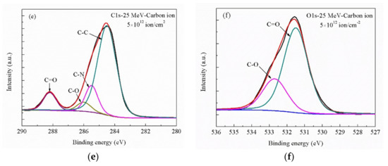 X-ray photoelectron spectroscopy (XPS) curves of pristine and irradiated PI films: (a) C1 s of pristine PI, (b) O1 s of pristine PI, (c) C1 s of irradiated PI with 3 MeV proton of 2.2 × 1012 p/cm2, (d) O1 s of irradiated PI with 3 MeV proton of 2.2 × 1012 p/cm2, (e) C1 s of irradiated PI with 25 MeV carbon ion of 5 × 1012 p/cm2, and (f) O1 s of irradiated PI with 25 MeV carbon ion of 5 × 1012 p/cm2.