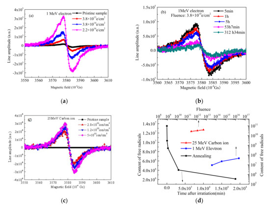 Electron paramagnetic resonance (EPR) curves of the pristine and irradiated PI films with different sources and fluences: (a) 1 MeV electron, (b) annealing after 1 MeV electron, (c) 25 MeV carbon ion, and (d) the change of the content of free radicals.