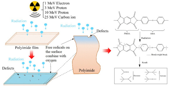 The schematic of the irradiation process and irradiation degradation process and results of XPS data of PI repeat unit is shown in Figure 8. The schematic shows that the PI films irradiated by the four kinds of irradiation sources, including 1 MeV electron, 3 MeV proton, 10 MeV proton, and 25 MeV carbon ion, may produce defects, and the free radicals on the surface of the irradiated PI films and the free radicals may combine with active factors such as oxygen. The accelerated 1 MeV electron, 3 MeV proton, 10 MeV proton, and 25 MeV carbon ion all have enough energy to break chemical bonds in organic materials. The irradiation sources may break the benzene ring, ether bonds, C–N bonds, and C=O bonds of the PI films. The most common result of chemical bond breakage is the formation of free radicals. From the EPR results, we know that the free radicals are the pyrolytic carbon free radicals. The irradiation processes can be classified according to the effects of formation of free radicals, including curing, cross-linking, degradation, and grafting [24]. The experimental XPS results show that the content of C=O bonds and C–N bonds decreases and the content of C–O bonds and C–C bonds increases. According to the results, we can know degradation is the main process and the fracture of chemical bonds often forms polymers with low molecular weight.