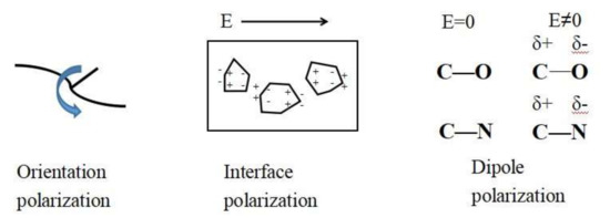 Simple schematic of orientation polarization, interface polarization and dipole polarization happened in PI films.