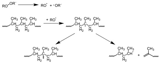 - PP-LCB can be achieved in different ways, but reactive extrusion is the most popular process. This type of process offers very short reaction times, little or no use of solvents, simple product isolation steps, and relatively low infrastructure costs [11,12]. In the literature, PP-LCB is a well-studied topic with different approaches to improve the properties of linear PP and their disadvantages [13,14,15,16,17,18,19,20,21,22]. In addition to introducing LCB onto the backbone of PP, further competition reactions can take place. PP in particular tends to undergo chain scission reactions, so-called β-scission, which creates smaller unsaturated fragments of chains [23,24]. There is a possibility that cross-linking occurs, but a prediction of this phenomenon is very difficult. The phenomenon of β-scission caused by the use of peroxides is also known as controlled rheology PP (PP-CR). This leads to a reduction in viscosity, which results in a reduction in average molar mass and a narrowing of PP’s molar mass distribution (MMD) [25]. Additional side reactions could occur, such as disproportionation or a combination of free peroxide radicals. In particular, at higher temperatures, the equilibrium shifts to β-scission or disproportionation, which negatively affects the branching [24]. For this reason, the extrusion temperatures in scientific works are mainly at lower temperatures (180 °C). However, in practice, high temperatures have been used for the extrusion process, which means that additional effects may have occurred such as increased chain scission or different reaction rates during the extrusion. Figure 1 shows a schematic representation of the LCB reaction process confronted with the β-scission of PP. In the first step, the peroxide decomposes under homolytic scission into two primary radicals, which abstract a hydrogen atom from the PP backbone and therefore a PP macroradical is generated. There are now two possible reactions that can take place—on the one hand, the LCB, and on the other hand, the β-scission of PP [26,27].