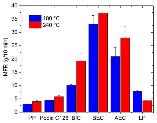 In addition, the trend of the viscosity curves shows nearly the same trend as the MFR values. For example, the viscosity curves of BEC display the lowest viscosity level at both extrusion temperatures (180 and 240 °C), and therefore the highest MFR values.