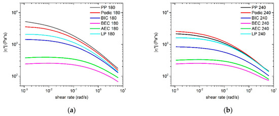 Complex viscosity versus shear rate of samples extruded at (a) 180 °C; (b) 240 °C; measured at 230 °C.