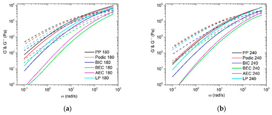 In addition to the complex viscosity, the storage modulus G’ and loss modulus G’’ (dashed lines) play an important role in the dynamic rheology. Both parameters provide information about viscous and elastic effects and the influence of shear rate or frequency on material functions [50]. The curves of G’ and G’’ of 180 and 240 °C extruded materials are presented in Figure 5. In all cases except for PODIC at 240 °C, it can be observed that the curves i.e., the crossover point of the modified PP, tend to have higher frequencies. Furthermore, it can be seen that not each curve has a crossover point. In particular, BEC displays no crossover points in both cases, which is attributable to the high MFR values. Morshedian et al. [51] reported that as the MFR increases, the crossover point shifts to higher frequencies.