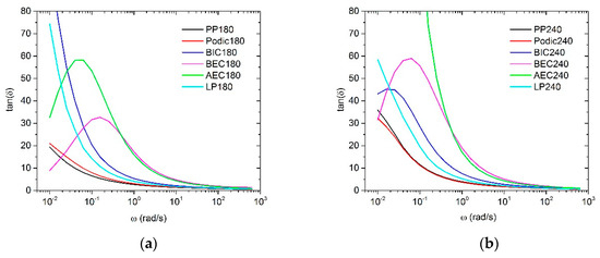 According to Wood-Adams et al. [56], the presence of LCB can be evaluated by using the plot of the loss angle δ and tanδ as a function of the frequency ω. Furthermore, De Maio and Dong [57] reported that higher elasticity leads to higher melt strength, which means that melt strength and tanδ are related to each other. The curves of all samples are shown in Figure 6. Normally, the linear polymer melt represents a monotonic decrease in tanδ by increasing ω. This behavior demonstrates the unmodified PP and the modified PP with PODIC at 180 °C. Their curves have nearly the same trend; only the gradient of PP is more pronounced. By comparison, BIC and LP show a typical terminal behavior of liquid-like materials because of the rapid decrease of tanδ with the increase of ω. BEC and AEC have an unexpected curve progression, which is not usual for conventional PP. Li et al. [48] and Sugimoto et al. [58] reported a similar unexpected rheological behavior of tanδ for their investigated samples. It is known in the literature that binary blends show a two-step rubbery plateau, which can only be seen for high molecular weight components [59,60,61,62]. However, the modification at 240 °C presented nearly the same behavior, whereas BIC also showed a second plateau and the curves of all samples displayed a steeper curve progression compared to that of the modification at 180 °C. The formation of such an unexpected curve progression supports the hypothesis of a strong degradation when using AEC, BEC, and BIC (at a higher temperature). All of them presented high MFR values, the lowest viscosity curves, and crossover points at high frequencies, or even no crossover points, which indicates that a possible degradation (β-scission) of PP is predominant.