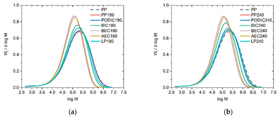 The corresponding curves of the GPC measurements are illustrated in Figure 7. The MMD of the virgin PP (without extrusion) was used for both cases as reference (dashed lines). In Figure 7a, the curves present nearly the same behavior compared to those of the reference PP and the unmodified PP. Only AEC and BEC show a significant change in MMD curves. The distribution becomes narrower and the peak maximum of MMD is distinctively increased and shifts to lower M values. The distribution of all samples, which were extruded at 240 °C, and the reference PP are shown in Figure 7b. It can be observed that all curves have nearly the same trend as the MMD curves at 180 °C. Therefore, the temperature difference during extrusion (180 °C or 240 °C) has no influence on the MMD via GPC. Only the use of the different peroxides presented a change in the distribution.