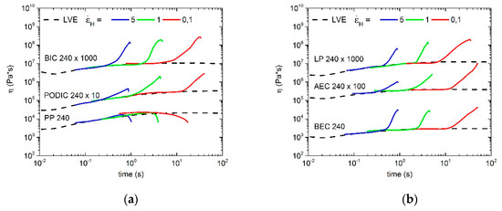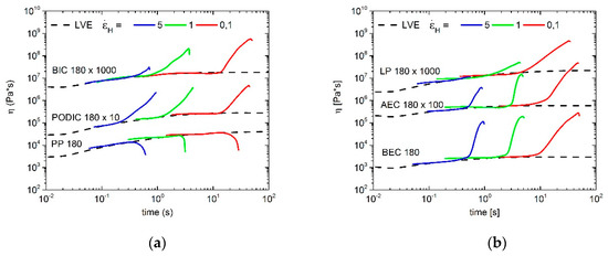 Extensional rheology of the different PP samples, (a) unmodified PP, PODIC and BIC; (b) BEC, AEC and LP, extruded at 240 °C; measured at 180 °C.