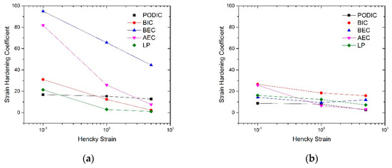 Strain hardening coefficient at different strains rates (0.1, 1, 5); modified at (a) 180 °C and (b) 240 °C.