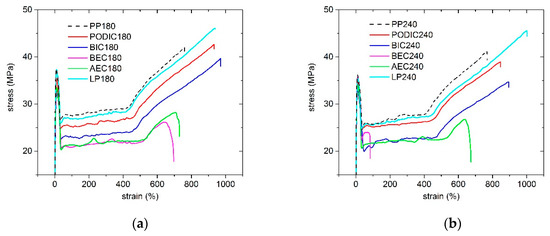 Stress–strain plots of unmodified PP and modified PP extruded at (a) 180 °C and (b) 240 °C.