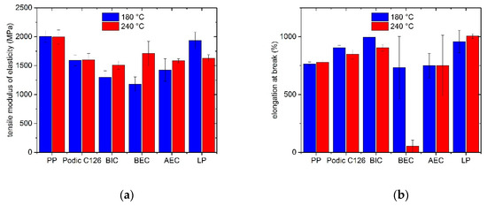 Results of the tensile test: (a) tensile modulus of elasticity and (b) elongation at break of the model mixtures extruded at 180 °C and 240 °C.
