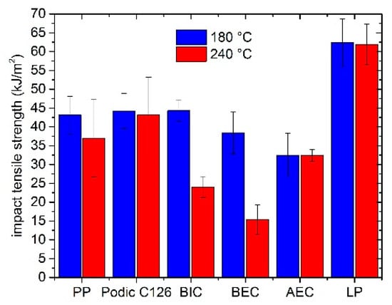 The results of tensile impact tests are shown in Figure 13. At 180 °C, the unmodified PP and the samples with PODIC and BIC have nearly the same impact tensile strength. Compared to this, BEC and AEC show a slight downward trend. Interestingly, the impact tensile strength of LP increased to 62 kJ/m2, which conforms to 50% more than unmodified PP.