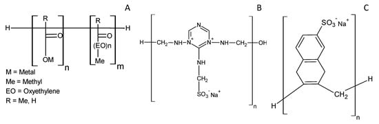 The second polymeric SP belongs to the family of the sulfonated melamine formaldehyde condensates (SMFC) (Figure 1B). In this synthetic polymer, each repeating unit contains one sulfonate group. The condensation number (n) is usually in the 50–60 range, giving a molecular weight in the order of 12,000–15,000 [35].