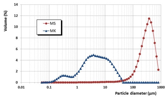 Specific surface areas, as measured by the BET method after N2 adsorption isotherms (ASAP 2020, Micromeritics, Norcross, GA, USA), for MK and MS were of 20.00 and 15.70 m2·g−1, respectively. According to the supplier, microsilica particles are spherical, main range of primary particle sizes between 0.2 and 1 µm, and the MS composition is at least 85% SiO2 content, with low carbon content [36]. The average particle sizes in aqueous suspensions were of ca. 3.9 µm for MK and 380 µm for MS (particle size distribution determined by laser diffraction in a Malvern Mastersizer, Malvern Instruments, Ltd., Malvern, UK, depicted in Figure 2), evidencing a clear agglomeration of the MS in comparison with the particle size of the primary particles [11,36].
