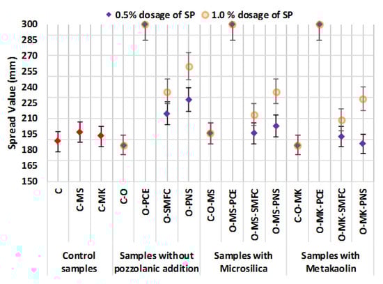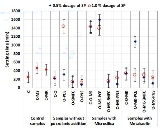 The use of PCE induced noticeable changes in workability for almost all mixtures (Figure 8). The addition of the PCE in microsilica-bearing samples gave rise to a delay in the stiffening of the grouts. This well-known effect has been pointed out in previous works and can be ascribed to the attachment of the PCE onto binding particles, which hinders their irreversible agglomeration, avoiding the early hardening of the grouts [11,55]. This delay was not observed for samples with MK at the highest dosage of PCE and can be explained by considering the fast pozzolanic reaction of the MK, as compared with microsilica. Stiffening time was shortened when SMFC and PNS were added as SPs. In almost all cases, for these two SPs (SMFC and PNS), the use of a 0.5% dosage yielded a sharper shortening of the stiffening time, which is directly linked to the poorer dispersing action of the lowest SP dosage due to the lower amount of adsorbed polymers.