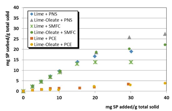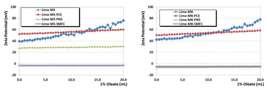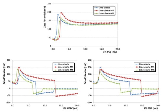Zeta potential measurements were carried out, upon titration with the different polymer-based SPs, for the lime–oleate pastes, as well as for the same pastes with the two pozzolanic additions (Figure 4).