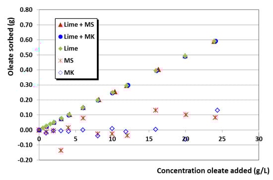 - Adsorption isotherms of sodium oleate onto lime particles (with and without pozzolanic additives) revealed a very strong adsorption of oleate onto these particles, making it reasonable achieving the saturation dosage of the first layer (Figure 5). Almost-negligible adsorption was observed for aqueous suspensions of pozzolans, confirming the strong influence of Ca2+ ions on the oleate adsorption, in agreement with the reported values in previous works by Wang, Z. et al. and Wang, Y. et al. [49,50] that described a sharp oleate adsorption onto minerals in the presence of calcium cations.