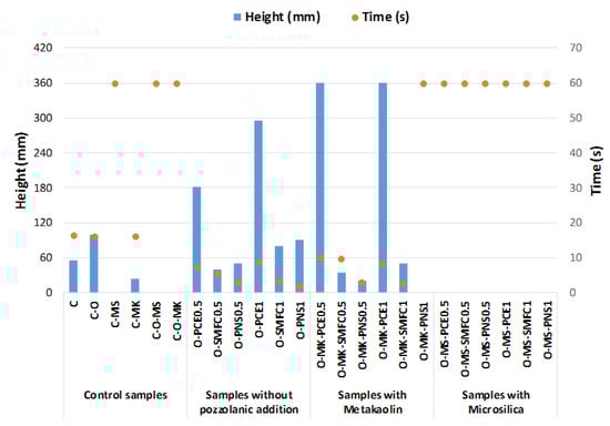 The injectability was measured for the designed grouts, including the two dosages of the SPs. The time of filling and the height reached by the grouts, upward from the bottom of the cylinders, were measured and are displayed in Figure 9. The injectability (s−1) was calculated as detailed in Section 2.3 and values are collected in Table 5.