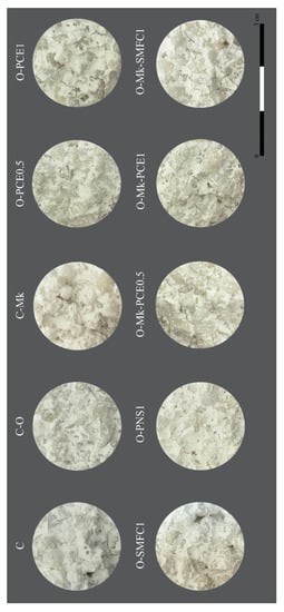 As shown in Figure 10, control grouts and grouts containing either PNS or SMFC were not able to fully fill the voids between the travertine fragments (slices showed holes and cracks, with heterogeneous areas caused by the poor injectability of these grouts and insufficient adherence to the travertine particles). Besides, C-MK sample showed a very poor wrapping of the travertine grains; holes are clearly visible in samples C, O-SMFC1 or O-MK-SMFC1; cracks are evident in samples C, O-PNS1 and O-MK-SMFC1.