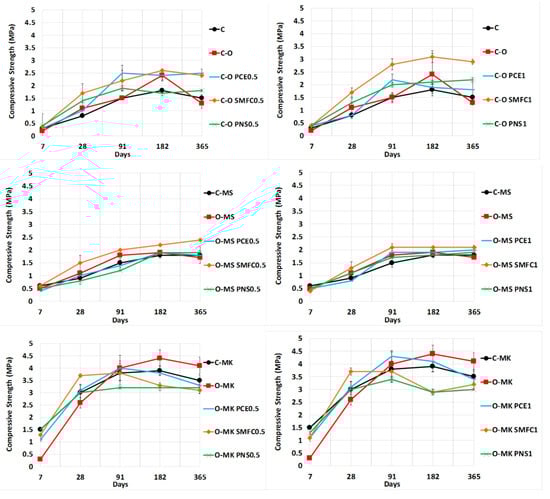 During the hardening process, plain lime-based systems exhibited an increase in mechanical properties, thanks to the carbonation process in which CaCO3 is formed over time. Therefore, the values of compressive strength after long-term curing times—182 and 365 days—were greater on average (Figure 11). Pozzolanic reaction and formation of C-S-H phases in grouts with pozzolans also contributed to the strength of the hardened grouts.