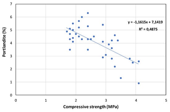 The addition of metakaolin increased the compressive strength, and the highest mechanical strength was obtained in the control mixture O-MK after 365 curing days (Figure 11). Microsilica was not so effective in increasing the strength. Its pozzolanic activity was lower as compared with MK, due to the larger particle size of the microsilica. TG-DTA analysis (Figure S2, Supplementary Materials) confirmed the differences: The percentages of Ca(OH)2 were lower for MK-bearing grouts (values after 182–365 curing days were on average below 4%, whereas samples with microsilica exhibited higher percentages of Ca(OH)2), suggesting a greater consumption of Ca(OH)2 during the pozzolanic reaction with MK. A Pearson correlation (coefficient 0.654, p < 0.01**) between the compressive strength and the percentage of portlandite was established: The higher the percentage of portlandite, the lower the compressive strength (Figure 12). It can be seen that most samples with percentages of portlandite below 4% yielded compressive strengths higher than 3 MPa, whereas samples with Ca(OH)2 percentages > 4%, in general, resulted in compressive strengths below 3 MPa.