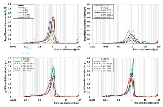 The use of superplasticizers was, in general, favorable in order to increase the final mechanical strength of the grouts, PCE and SMFC, yielding the highest values. This finding is ascribed to the refinement of the pore structure caused by the superplasticizer, especially by PCE. The assessment of the pore size distributions (Figure 13) of the grouts showed the following: