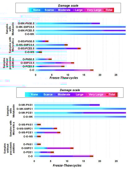 The presence of pozzolanic admixtures in the grouts displayed different results: The addition of microsilica resulted in an adverse effect on the freeze–thaw durability, as can be seen in the control samples with microsilica (sample C-O-MS), showing serious decay after just two cycles (Figure 14). Conversely, the addition of metakaolin improved the resistance in the face of freezing–thawing cycles. According to the results, the reduction in the mean pore size prevented the absorption of liquid water, blocking its later freezing and expansion damage and thus providing better resistance against freezing–thawing cycles.