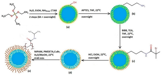 There have been numerous examples of nanocarriers composed of thermoresponsive polymers that can be applied for releasing active substances using either temperature-triggered or other types of mechanisms [23,24,25,26,27]. One may observe also a growing interest concerning mechanized silica nanoparticles that utilize supramolecular nanovalves responding to external stimuli for controlled release of encapsulated substances [28,29,30,31,32]. Similar stimuli-responsive functions may be also offered by polymers, especially thermoresponsive ones such as: poly(N-isopropylacrylamide) (PNIPAM) [33,34,35] or poly(N-ethyl oxazoline) [36,37] in the form of surface-grafted polymer brushes. PNIPAM chains undergo a phase transition in water from a swollen to collapsed dehydrated state while heating above 32 °C (LCST—lower critical solution temperature) that is related to breaking of hydrogen bonds. These conformational changes of PNIPAM were firstly observed by Heskins and Guillet [38] and later broadly studied and applied both in solutions and for surface grafted macromolecules [39,40]. This behavior of PNIPAM enables the fabrication of various porous and nonporous materials decorated with the polymer chains for e.g., temperature-triggered gating of pores or controlled adsorption/desorption leading to so-called “smart” surfaces [41,42,43,44]. For that purpose typically reversible-deactivation radical polymerizations are used including atom transfer radical polymerization (ATRP) [45] as a primary choice for obtaining not only well-defined macromolecular architectures in solution (e.g., star polymers [46]) but also surface-grafted polymer brushes [47]. While grafting of PNIPAM from silica nanoparticles has been commonly carried out using ATRP [48,49,50] other surface-initiated polymerizations like NMP (nitroxide-mediated polymerization) [51] and ROMP (ring opening metathesis polymerization) [52] have also been applied.