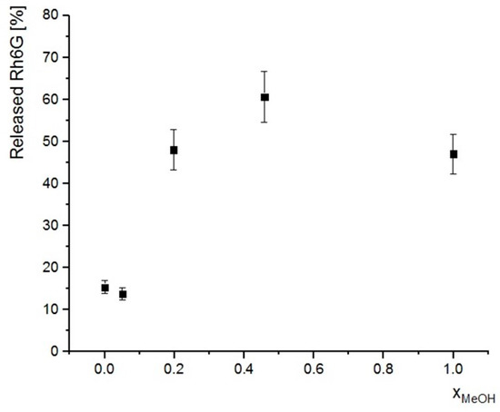 The release of the adsorbed Rh6G from the nanoparticles to pure water above LCST was found inefficient confirming the strong adsorption of the positively charged dye molecules on the negatively charged silica surface. Thus, the release of the cargo molecules was achieved in a water/methanol mixture. While the presence of methanol should promote desorption of Rh6G, PNIPAM chains undergo also reversible “coil-globule” transition at certain compositions of water/alcohol mixtures as shown both in solution [56] and for polymer brushes [33,57]. Figure 5 presents the efficiency of release of the cargo Rh6G molecules from the previously loaded SCMS-PNIPAM(4). One may expect more efficient release of Rh6G for the increasing content of methanol but it appears that the relation in Figure 5 shows a clear maximum. A low concentration of methanol in the mixture does not lead to collapse of the PNIPAM chains so the release efficiency is practically the same as for pure water. Only after increasing the methanol content (xMeOH = 0.2) the PNIPAM chains aggregate opening the pores and the release efficiency increases significantly to ca. 50%. A further increase of methanol content to xMeOH equal to ca. 0.45 enhances the release of the dye. Lower efficiency was obtained for pure methanol, which on one side enhances the desorption of the dye, but on the other side increases the swelling of PNIPAM chains that limit diffusion of Rh6G from the pores. This is consistent with the co-nonsolvency effect—PNIPAM brushes become soluble in the mixture with xMeOH > 0.5 [58]. Thus, although more methanol in the mixture should enable more efficient desorption of Rh6G molecules the gating system limits their diffusion from the pores.