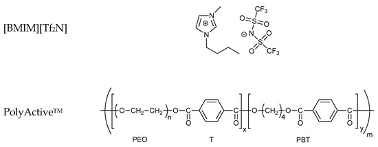 Chloroform (99%) was purchased from Penta Chemicals (Prague, Czech Republic) and VWR (Milan, Italy) and was used as the solvent for membrane preparation. All gases for the permeation tests were supplied by Sapio (Monza, Italy) at a minimum purity of 99.9995+%. The ionic liquid used in this study was 1-butyl-3-methylimidazolium bis(trifluoromethylsulfonyl)imide (abbreviation [BMIM][Tf2N], ≥98%), and was purchased from Sigma-Aldrich (Prague, Czech Republic). Two grades (1500PEOT77PBT23 and 4000PEOT77PBT23) of the thermoplastic elastomer PolyActiveTM, a polyethylene oxide terephthalate-polybutylene terephthalate (PEOT-PBT) multiblock copolymer, were purchased from PolyVation B.V., Groningen, The Netherlands, who supplied two other grades, 1000PEOT55PBT45 and 4000PEOT50PBT50, as a free sample. The first number in the code stands for the molecular weight of the PEO block, and the second and third numbers indicate the fractions (in wt.%) of the PEOT and the PBT blocks, respectively (Table 1). The generalized structure of PolyActiveTM PEOT-PBT copolymers and the chemical structure of [BMIM][Tf2N] are given in Figure 1.