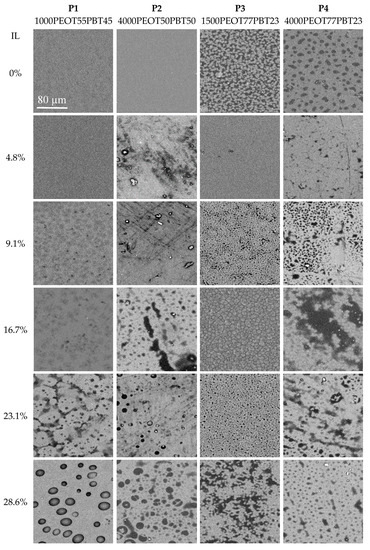 Polymer solutions of 5 wt.% of P1, P3, and P4 grades of PolyActiveTM in chloroform were prepared at room temperature under stirring for 2 h. Different amounts of the ionic liquid [BMIM] [Tf2N] were added to the polymer solutions and stirred for another 2 h at room temperature. PolyActiveTM grade P2 was dissolved at 3 wt.% in chloroform, by stirring for 2 h close to the boiling temperature (ca. 60 °C), yielding a slightly hazy solution. After adding the required amounts of ionic liquid, the solution was stirred for another 2 h at 60 °C. The final polymer/IL/chloroform solutions were poured into Teflon Petri dishes. The Petri dishes were partially covered to ensure slow evaporation of the solvent and to avoid contamination by dust particles. The solvent was evaporated at 35 °C for at least 24 h until the film was formed. P2 samples showed shrinkage upon solvent evaporation. The films were then easily removed from the Petri dishes. Table 1 gives an overview of the sample characteristics.