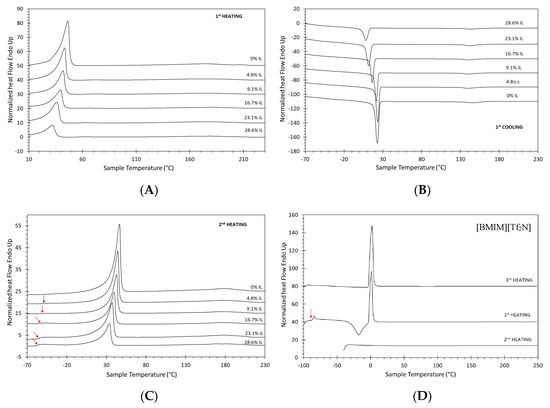 Example of DSC curves of sample P4 as a function of the ionic liquid (IL) content (in wt.%) at a heating and cooling rate of 15 °C min−1. (A) First heating run, (B) cooling run, (C) second heating run. (D) DSC curves of the pure ionic liquid [BMIM][Tf2N] obtained after different cooling procedures. The curves are shifted vertically for clarity and the Tg is indicated with a red arrow. Program of the analysis of the pure ionic liquid: First heating after normal cooling to −100 °C, second heating after cooling to −40 °C and annealing for 20 min; and third heating after normal cooling to −100°C, heating to −10 °C, annealing for 10 min, followed by a second cooling to −100 °C (see the full temperature program of the IL in Table S1).