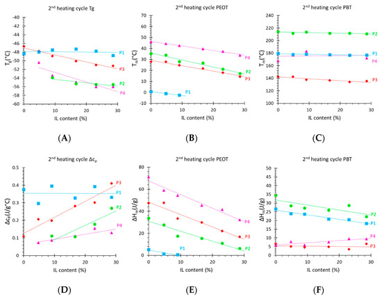 (A) Glass transition temperature, (B) poly(ethylene oxide terephthalate) (PEOT) phase melting temperature, and (C) polybutylene terephthalate (PBT) phase melting temperature. (D) Change in specific heat, and (E) melting enthalpy of the PEOT phase and (F) of the PBT phase.
