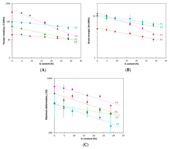 All the prepared membranes have typical rubbery behavior, characterized by low modulus and high elongation (Figure 5). The neat P4 polymer has the highest Young’s modulus, which drastically decreases with increasing IL concentration, showing that this IL acts as a strong plasticizer for this grade of PolyActiveTM having the lowest amount of hard PBT blocks and the highest PEOT block length. The drastic decrease in Young’s modulus and break strength with increasing IL content in P4 is mostly a result of the decrease in the crystallinity of the PEOT phase, as was confirmed by DSC analysis (Figure 4E). In addition, the P2 series, which has a similar Mw of PEOT but a higher fraction of PBT, shows a significant decline in the elastic modulus as a function of the IL content. Therefore, it can be concluded that a higher Mw of soft phase will enable more efficient crystallization, which will give better mechanical properties to the membrane, in accordance with previously reported work [36]. At the same time, these polymers will be affected most by the presence of the IL. P1 and P3 are less affected by the presence of the IL due to the low Mw of their PEOT domains. Sample P1 has a higher modulus and break strength than sample P2, with similar content of the PBT hard segments, but with higher Mw of the PEOT blocks and higher ∆Hm of both phases. Apparently, the stronger microphase separation in P2 leads to relatively poor mechanical properties. For entropic reasons, low-molecular-weight compounds mix better with each other and, similarly, polymers with shorter block lengths tend to be more compatible and the phase separation between the soft and hard segment will decrease with the lower Mw of the PEOT phase [36,39], where inter-chain interactions become more important than intra-chain interactions. As inter-chain interactions are relevant for network formation, this will result in increased mechanical strength and elasticity of the sample [29]. Maximum deformation is higher in the more flexible P4 grade (high Mw of PEOT and high fraction), and then follows the trend P3 (low Mw of PEOT but high fraction) > P2 (high Mw of PEOT but low fraction) > P1 (low Mw of PEOT and low fraction) over the entire composition range, and it decreases with IL content for all four grades of PolyActiveTM.