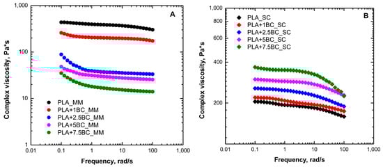 Complex viscosity as a function of frequency for neat poly(lactic acid) (PLA) and biochar (BC)-containing composites obtained through melt mixing (MM) (A) and solvent casting (SC) (B).
