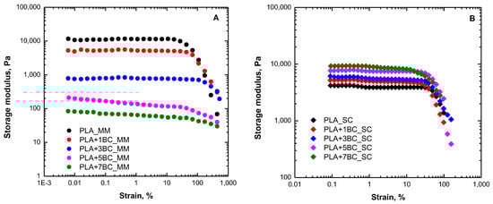 Further important information about the interactions existing in polymer-based composites can be derived from the analysis of the rheological response under large deformations; Figure 2A,B show the results of large amplitude oscillatory shear (LAOS) measurements, in terms of variation of the dynamic storage modulus (G′) as a function of the applied strain amplitude. All investigated systems exhibit a plateau in the low strain region, followed by a decrease of the G′ values. The beginning of the G′ drop is an indication of the transition from linear to non-linear viscoelastic regime and is the result of the preferential alignment of the polymer macromolecules along the flow direction [38]. The results reported in Figure 2 confirm the behavior already noticed through frequency sweep tests; specifically, for melt mixed composites, a progressive decrease of G′ values can be observed as the BC content rises. Conversely, for solvent cast systems, higher modulus values are achieved for composites containing increasing filler amounts. Additionally, for melt mixed composites, an increase of the critical strain at the beginning of the non-linear viscoelastic regime can be noted as a function of BC content, and for PLA+7.5BC_MM, the linear region covers the whole investigated strain amplitude range, indicating that the rheological behavior of composites under large deformations is governed by PLA. At variance, in solvent cast composites, a different trend can be observed as, in this case, the linear viscoelastic range slightly decreases for the systems containing higher filler amounts.