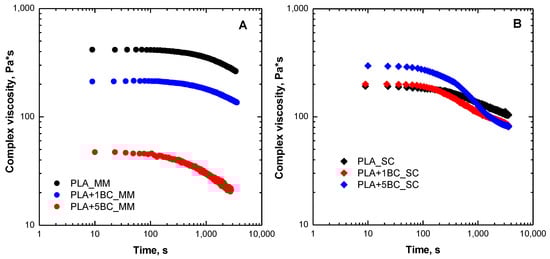 Time evolution of the complex viscosity at 170 °C for neat PLA and BC-containing composites obtained through melt mixing (A) and solvent casting (B).