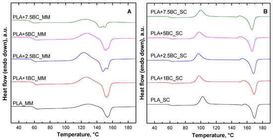 Differential scanning calorimetry (DSC) thermograms recorded during the second heating scan for neat PLA and BC-containing composites obtained through melt mixing (A) and solvent casting (B).