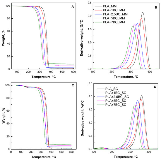 Thermogravimetric (TG) (A,C) and dTG (B,D) curves for neat PLA and its composites obtained through melt mixing (A,B) and solvent casting (C,D).