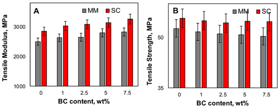 The mechanical properties of the PLA-based systems were evaluated through tensile tests; the obtained mechanical properties, namely tensile modulus and tensile strength, are plotted in Figure 7A,B as a function of the BC content. For both melt mixed and solvent cast materials, tensile modulus values increase with the increasing BC loading, confirming the homogeneous dispersion of the embedded filler within the polymer matrix. However, the tensile strength of BC-containing systems is slightly decreased as compared with the neat PLA matrices; this finding can be associated with the premature failure of the biocomposites, owing to the presence of voids in the porous structure of BC particles.