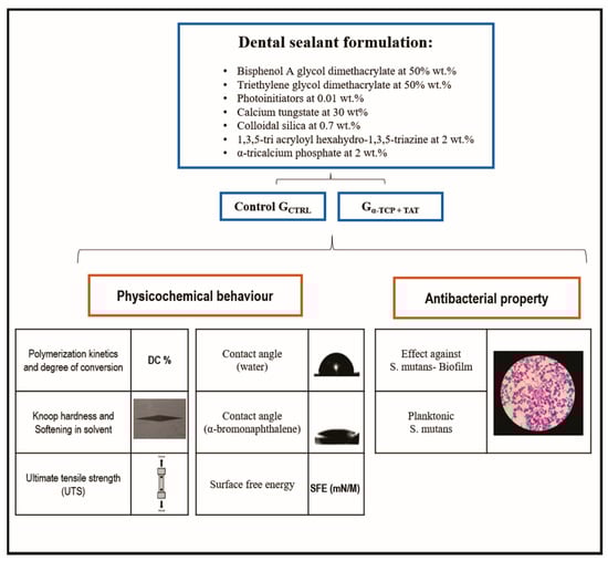 For resin sealants formulation, bisphenol A glycol dimethacrylate (BisGMA) at 50 wt.% and triethylene glycol dimethacrylate (TEGDMA) at 50 wt.% were used. Camphorquinone (CQ) and ethyl 4-dimethylaminobenzoate (EDAB) at 1 mol%, according to the monomer moles were added as a photoinitiator system. Butylated hydroxytoluene (BHT) at 0.01 wt.% was also used as a stabilizer. Calcium Tungstate was added as a radiopacifier agent at 30 wt.%. Colloidal silica was added at 0.7 wt.% for viscosity adjustment, while α-TCP [] and TAT (Gα-TCPTAT) were added to the experimental resin sealant at 2 wt.% each. A control resin sealant was formulated without the use of α-TCP and TAT (GCTRL). All the chemicals listed so far were purchased from Aldrich Chemical Company, St. Louis, MI, USA. All specimens, except those for ultimate tensile strength evaluation, were prepared using a polyvinylsiloxane mold with 1 mm thickness and 4 mm diameter. Next, the resin was photoactivated for 30 s on each side using a light-curing unit (Radii Cal, SDI, Bayswater, Victoria, Australia) at 1200 mW/cm2. The specimens for the polymerization kinetics were photoactivated for 30 s on the top. Figure 1 displays a schematic diagram of the experimental design and the type of assessments employed in this study.