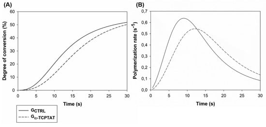 All the experimental resin sealants were formulated and evaluated regarding the polymerization kinetics and DC % by FTIR-ATR. DC % represents the percentage of carbon double bond conversion and high values are associated with better mechanical properties and reduced matrix degradation []. TAT is a tri-functional monomer, presenting three aliphatic double bonds (C=C) that are able to copolymerize, which may also increase double bond conversion []. In the polymerization kinetics regarding DC % per time, no significant statistical difference was observed between the tested groups. On the other hand, at the polymerization rate per time analysis, the difference can be observed in Figure 1, indicating that the reaction was delayed for Gα-TCPTAT. Such a result may be related to an increase of resin sealant viscosity, as well as to the decrease of monomers mobility for Gα-TCPTAT, leading to a non-difference of DC % between groups even with the addition of this trifunctional molecule (TAT) []. Gα-TCPTAT presents more inorganic filler due to α-TCP addition, which may have caused a reduction of the transmission of the light during the light-curing procedures, so reducing the DC % compared to GCTRL []. The presence of TAT may have made it possible to incorporate a filler (α-TCP) with a very different refractive index than the resin matrix without changing the polymerization degree. Nevertheless, both groups achieved reliable DC %, with values comparable to those of resin sealants currently available in the dental market [].