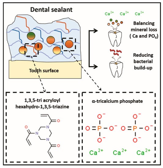 Resin-based sealants are effective in preventing and reducing caries because they work as a physical barrier that prevents tooth demineralization []. The antibacterial monomer TAT and α-TCP, a remineralizing agent (Figure 3), were incorporated at 2 wt.% each in an experimental resin sealant. Gα-TCPTAT showed antibacterial activity against biofilm formation and planktonic cells of S. mutans and increased the UTS values without compromising the physicochemical properties of the sealant.